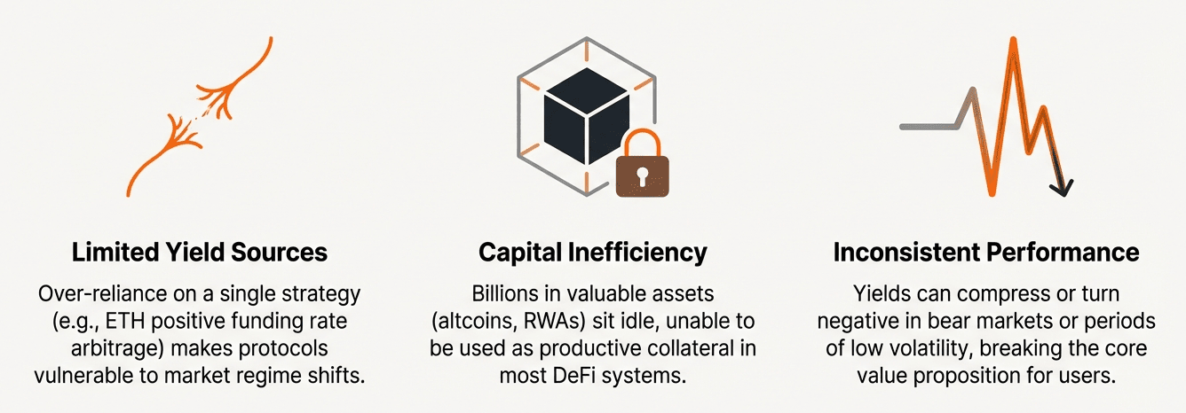 Los protocolos sintéticos tradicionales de dólar dependen de estrategias de rendimiento limitadas, como el arbitraje de tasa de financiación o el delta-neutral con base positiva. Estos enfoques luchan por mantener rendimientos competitivos en condiciones adversas del mercado, dejando el capital subutilizado y a los usuarios expuestos.