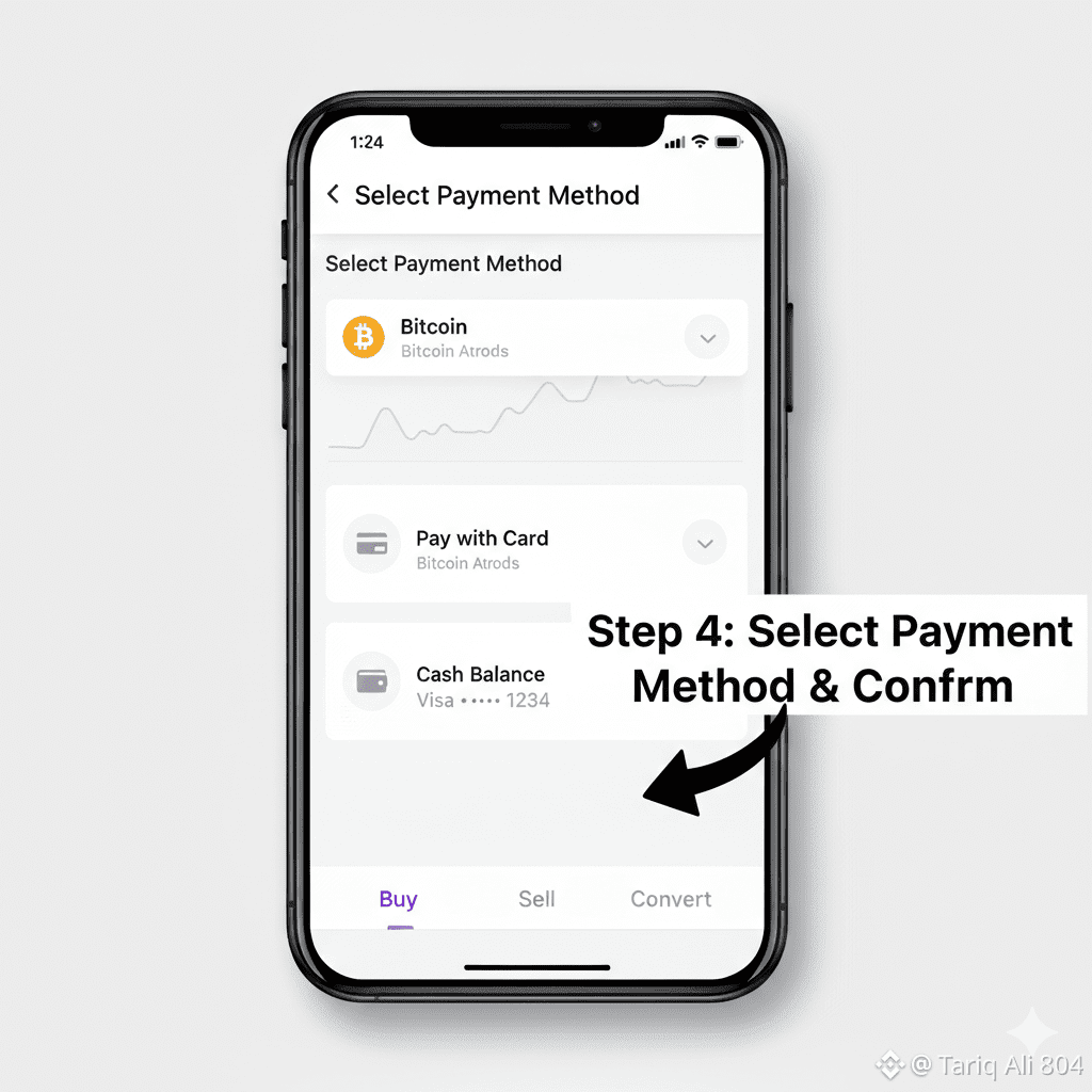 Select the cryptocurrency you wish to buy (e.g., BTC, ETH, BNB) and enter the fiat amount (e.g., USD, EUR) you want to spend.Step 4: Select Payment Method