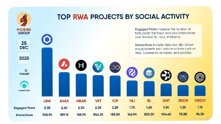 Basado en análisis sociales recientes de diciembre de 2025, Chainlink ($LINK) es el líder indiscutido en discusiones relacionadas con RWA, muy por delante de sus competidores.