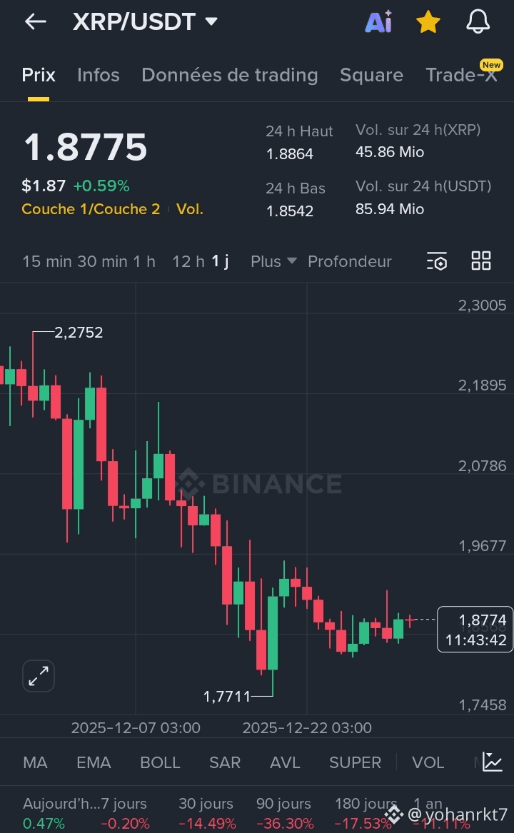 * Prix Actuel : Le XRP se stabilise autour de 1,87 $, montrant une solidité remarquable au-dessus d'une zone de support clé.