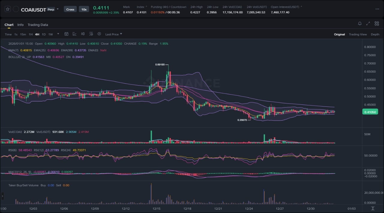 Después de una poderosa ola distributiva que vio caer los precios desde el máximo local de aproximadamente 0.69100 a mediados de diciembre, COAI entró en un período de estabilización. La caída inicial encontró un suelo cerca del nivel 0.35870, un punto desde el cual los vendedores no pudieron presionar su ventaja más. Desde finales de diciembre, el activo ha estado atrapado en un rango de consolidación lateral. Esta acción de precios ha neutralizado efectivamente el momentum bajista anterior, pero aún no ha confirmado una reversión. En cambio, ha creado un campo de batalla donde tanto los alcistas como los bajistas han establecido sus líneas. El resultado es una estructura de mercado que actualmente carece de dirección en marcos temporales más bajos, esperando pacientemente un catalizador que fuerce una ruptura y establezca un nuevo sesgo direccional. La convergencia de promedios móviles clave y el extremo estrechamiento de las Bandas de Bollinger en el gráfico de 4 horas subrayan este período de indecisión en el mercado.