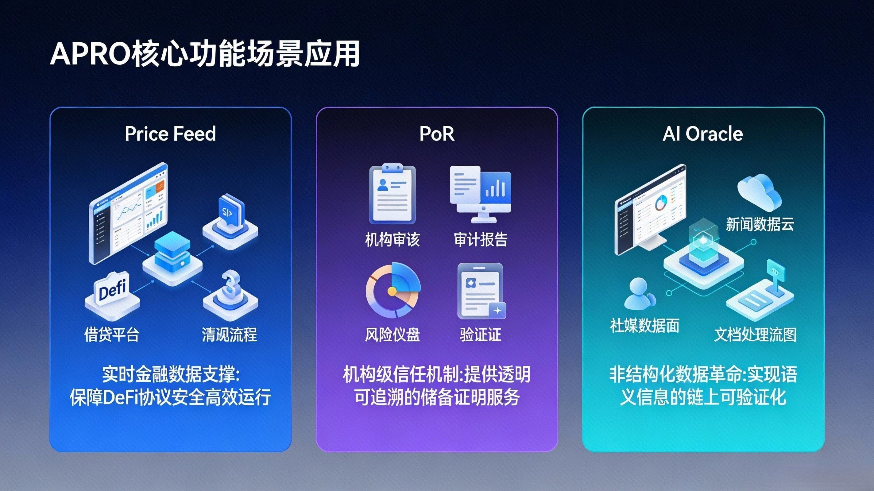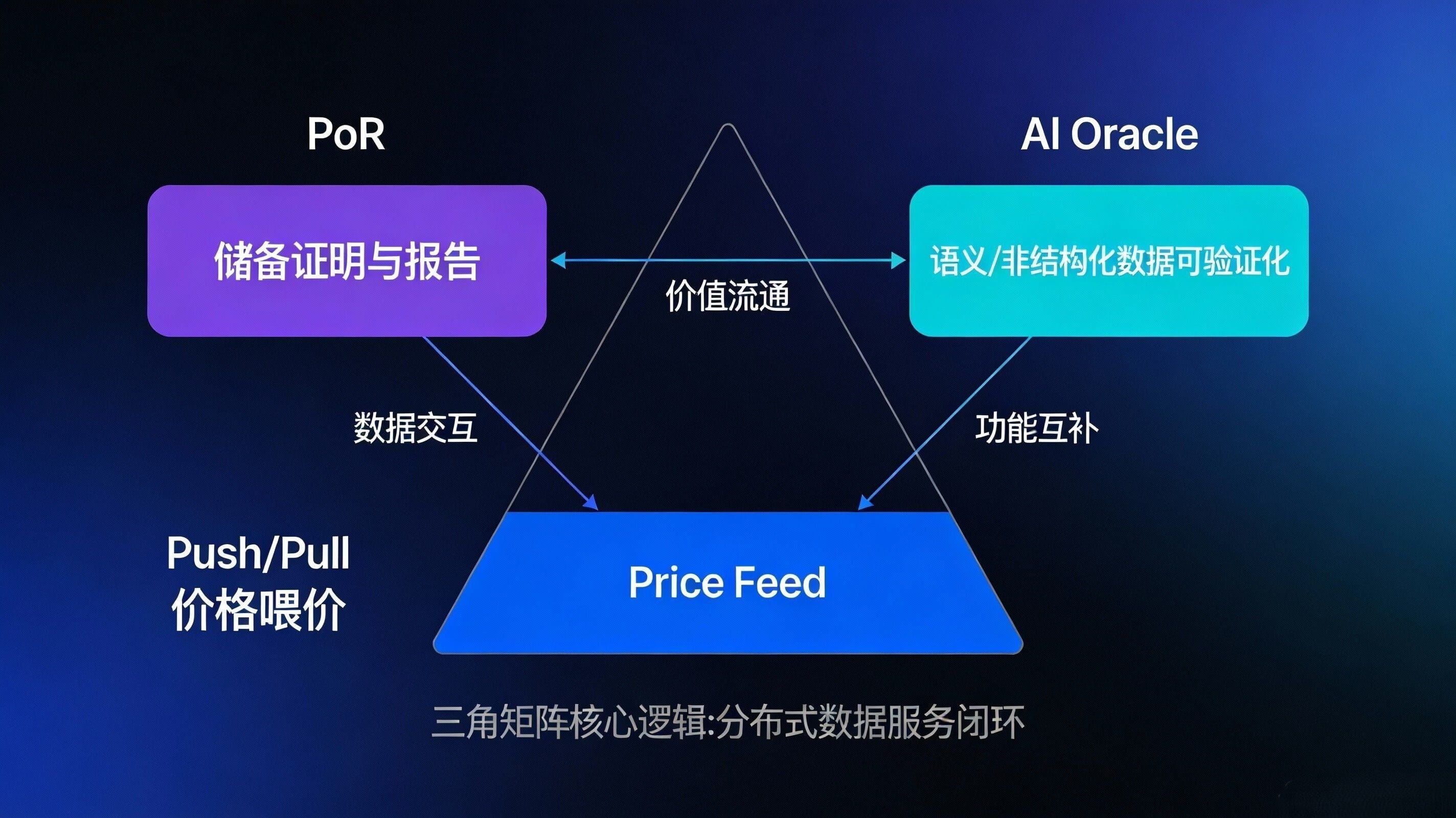 Te sugiero que primero recuerdes la matriz de productos completa de APRO con un gráfico triangular "autoexplicativo"; después, escribir cualquier detalle será menos probable que se desvíe: el lado inferior del triángulo es el Price Feed (dos formas de entrega: Push/Pull), la esquina superior izquierda es PoR (prueba de reservas e informes), y la esquina superior derecha es AI Oracle (verificación de datos semánticos/no estructurados). El lado inferior resuelve la "demanda básica de agua, electricidad y carbón" de DeFi, mientras que las dos esquinas superiores abordan la "entrada de alta responsabilidad" de RWA y mercados de predicción, y la economía de agentes. La documentación del Price Feed y la entrada del contrato especifican claramente la "utilidad de ingeniería", que es un producto de datos estándar que los desarrolladores pueden conectar fácilmente; el documento de PoR convierte la "prueba a nivel institucional" en un sistema de informes que se puede consultar y rastrear, y enfatiza claramente la capacidad de múltiples fuentes de datos y análisis de documentos, detección de anomalías y alertas de riesgo, que están más cerca de la entrega empresarial; AI Oracle incluye noticias, redes sociales, documentos complejos y otros materiales no estructurados en su ámbito verificable, y mediante la verificación y el mecanismo de resolución, reduce el costo de disputas a entradas que se pueden liquidar.