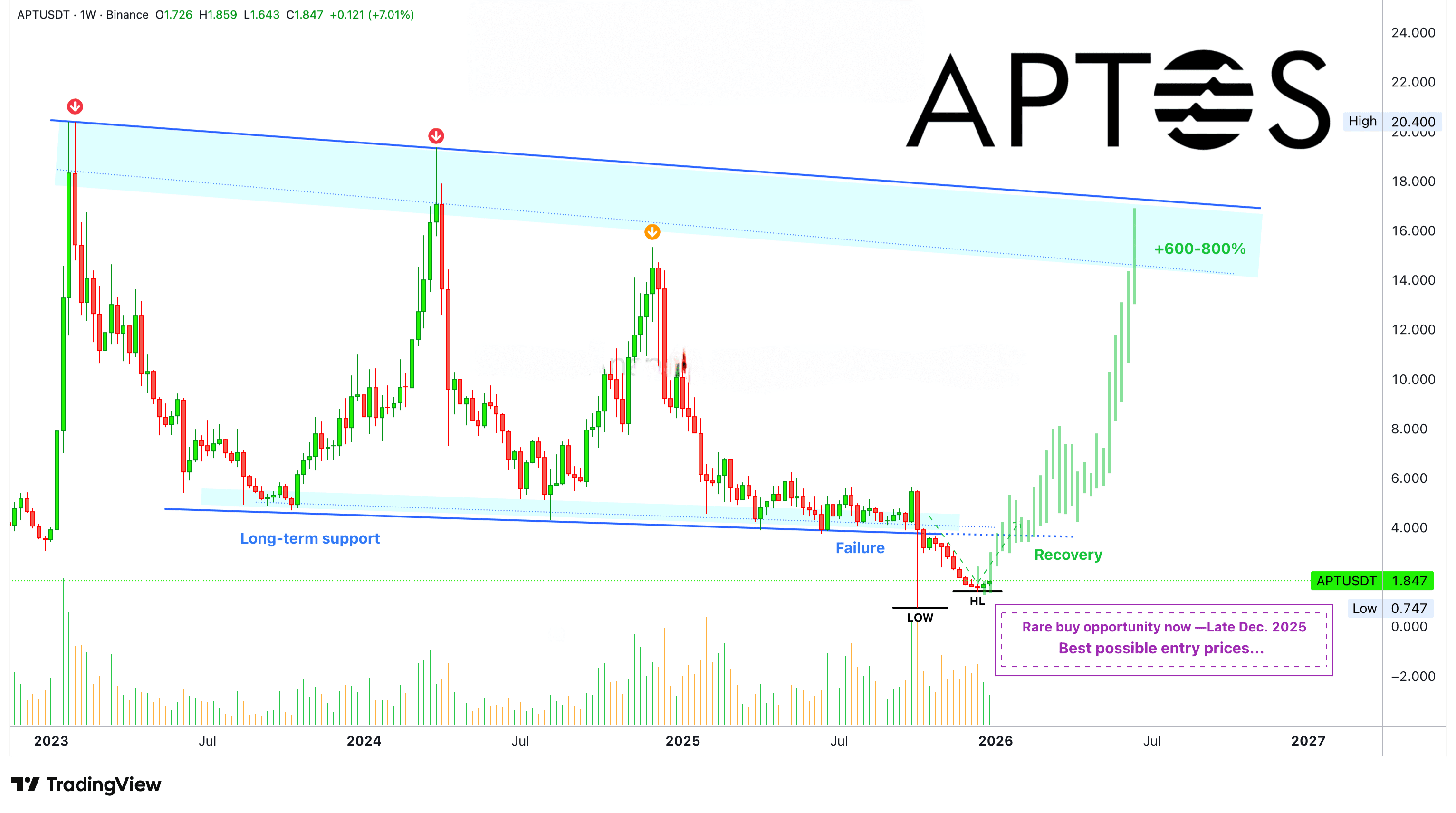 La semana pasada APTUSDT se volvió verde, cerrando la primera semana verde desde el desalojo del mercado. Esta semana también es verde y el año está comenzando verde también. La acción de hoy es más alta en comparación con el máximo de la semana pasada y esto es extremadamente positivo. Nota el tamaño de las velas en el mínimo más alto (HL), esto revela poca acción, sin volatilidad, un verdadero fondo y mucho espacio disponible para el crecimiento.