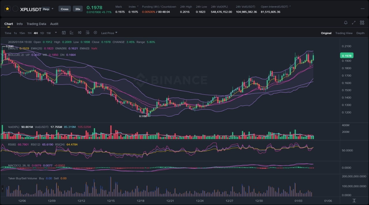 Al analizar la formación de velas, XPL rompió impulsivamente desde una línea de tendencia descendente que conectaba los máximos de oscilación desde mediados de diciembre, invalidando el canal bajista previo con volumen elevado. Este movimiento se alinea con la mecánica clásica de ruptura, donde el precio superó el máximo del rango cerca de $0.15, desencadenando cacerías de órdenes de stop-loss por debajo de los mínimos recientes y creando un bolsillo de liquidez para que los compradores lo defiendan. Tras la ruptura, observamos una consolidación tipo bandera con volumen decreciente, un sello distintivo de patrones de continuación, pero el rechazo en la frontera superior en $0.17 sugiere oferta sobre el precio. Las EMAs ofrecen confluencia: la EMA de 50 periodos actúa como soporte dinámico tras el rally, mientras que la EMA de 200 se mantiene por debajo, reforzando la estructura de mínimos más altos. La volatilidad, medida por las Bandas de Bollinger, ha aumentado bruscamente, con el precio pegado a la banda superior—alcista hasta que ocurra una corrección de reversión media a la banda media. El sesgo principal sigue siendo alcista porque el volumen de ruptura superó en 2-3 veces el promedio del anterior tendencia bajista, indicando interés institucional, pero la invalidación neutral a bajista se cierne si el precio recupera el soporte de la línea de tendencia rota.