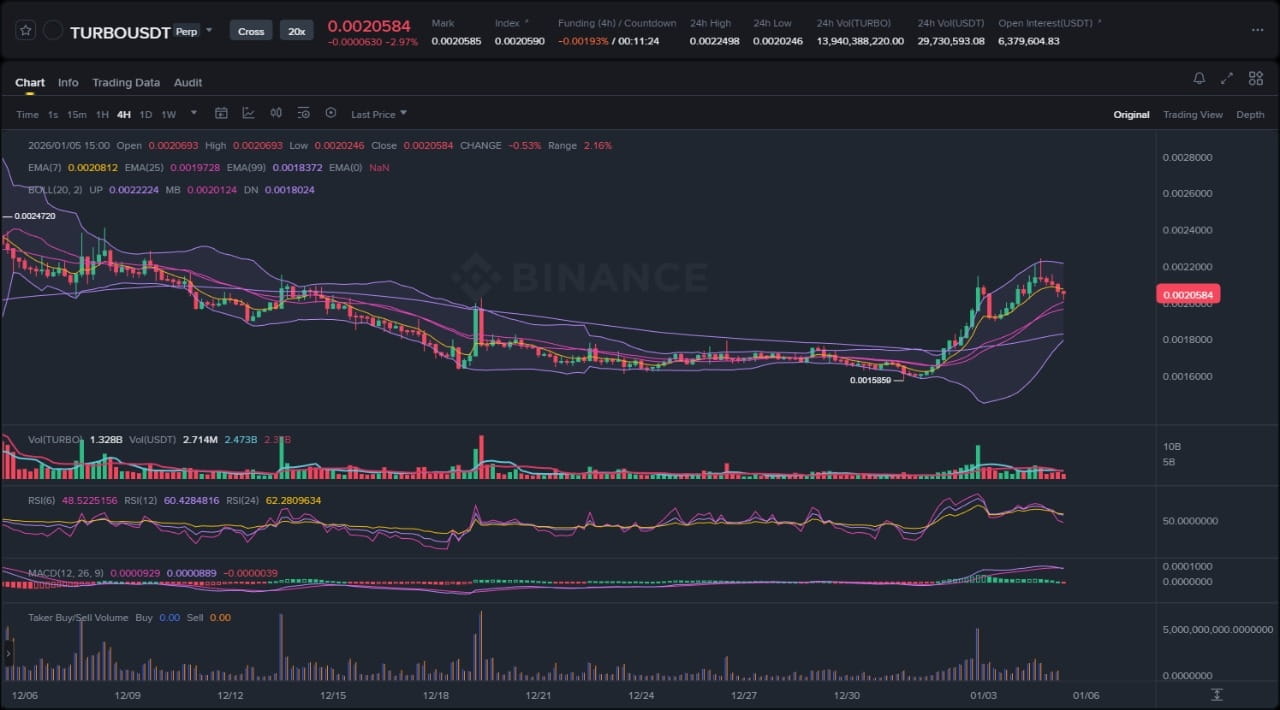 El gráfico de Binance para TURBO revela una clara ruptura de un canal de tendencia bajista de varias semanas, transicionando a una estructura alcista impulsiva. Los patrones de velas muestran un avance vertical agudo en las últimas 24 horas, atravesando niveles de resistencia previos con volatilidad expandida. Los elementos clave observables incluyen la media móvil de 50 períodos cruzando decisivamente por encima de la MA de 200 períodos—confirmando el cruce dorado—junto a un aumento de volumen que eclipsa los promedios recientes, indicando una fuerte compra por convicción. Los máximos locales de mediados de noviembre son ahora soporte, mientras que el rechazo de las bandas de Bollinger inferiores subraya el cambio de momentum. En general, la tendencia sigue siendo alcista, ya que la acción del precio respeta bajos más altos dentro de la tendencia alcista, sin señales inmediatas de distribución evidentes.