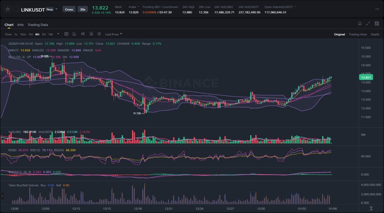 LINK actualmente se negocia a aproximadamente $13.41, reflejando ganancias diarias del 1.9% mientras los mercados de criptomonedas más amplios inician 2026 con optimismo medido. El gráfico adjunto de Binance en un marco de tiempo de 4 horas revela una clara fase de consolidación después de un movimiento impulsivo hacia arriba desde mínimos locales alrededor de $12.50 a principios del período. La acción del precio ha respetado el límite inferior de un rango restringido entre $13.00 y $13.80, con una volatilidad reducida que sugiere acumulación antes de una posible expansión. Las EMAs proporcionan una estructura alcista: la EMA de 7 períodos se inclina hacia arriba y se sitúa por encima de la EMA de 25 períodos, mientras que ambas están por encima de la EMA de 99 períodos, confirmando una tendencia ascendente general a pesar del comportamiento limitado a corto plazo. Las Bandas de Bollinger se han contraído significativamente, con el precio abrazando la banda media (SMA de 20 períodos), lo que indica un potencial de reversión a la media y una inminente ruptura de volatilidad. Este setup posiciona a LINK en un patrón de acumulación de alta probabilidad, probando bolsillos de liquidez cerca de la resistencia anterior ahora convertida en soporte.