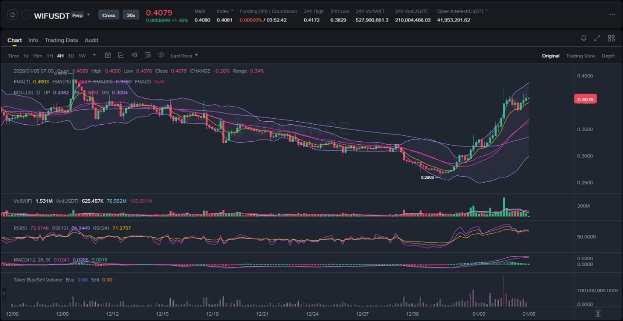 Los últimos tres titulares pintan una imagen uniformemente alcista para WIF, agrupándose en dos temas dominantes sin conflicto con el intento de ruptura del gráfico. Primero, el optimismo técnico domina, con dos artículos de Blockchain News (5 de enero y 3 de enero) pronosticando objetivos de $0.45 y $0.48 dentro de 3-4 semanas y 30 días, respectivamente, citando histogramas de MACD positivos, RSI en 59.50 y un potencial al alza del 41% desde el momentum alcista, reflejando directamente los indicadores del gráfico y reforzando el nivel de 0.2029 como una plataforma de lanzamiento. En segundo lugar, el momentum de la acción del precio se destaca en el artículo de AMBCrypto (4 de enero), notando un salto del 13% desde la base de la cuña pero advirtiendo que la convicción total requiere alineación de métricas, que ahora parecen proporcionar el cruce de EMA del gráfico y el aumento del volumen. Ambos temas son inequívocamente alcistas para WIF, sin señales bajistas ni mixtas; el bombo específico del proyecto en torno a la resiliencia meme de dogwifhat amplifica los vientos en contra macroeconómicos en la liquidez del ecosistema de Solana. Notablemente, este sentimiento de noticias se sincroniza sin problemas con el gráfico: no hay dinámicas de "vender la noticia" evidentes, ya que el precio está manteniendo ganancias en lugar de desvanecerse, sugiriendo una acumulación genuina sobre la distribución.