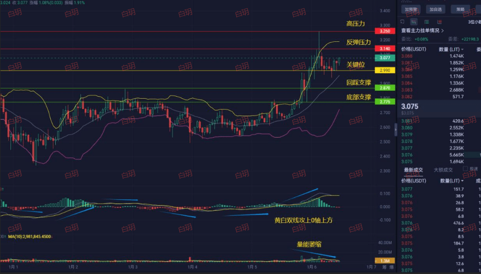 Observando el gráfico de 4 horas de LIT, el precio es de 3.076 dólares, está rebotando al alza. En el gráfico hay varios niveles clave: hacia arriba, el alto nivel de resistencia está en 3.260 dólares, el nivel de resistencia de rebote está en 3.140 dólares; hacia abajo, el nivel clave es 3.077 dólares, ahora está cerca de aquí, retrocediendo al nivel de soporte de 2.870 dólares, el nivel de soporte en la parte inferior es 2.775 dólares. En los indicadores técnicos, las líneas amarilla y blanca ya han subido por encima del eje 0, lo que indica que la tendencia alcista apenas está comenzando, pero el volumen ha disminuido un poco, lo que significa que la fuerza de subida no es lo suficientemente fuerte, hay que tener cuidado con un retroceso.