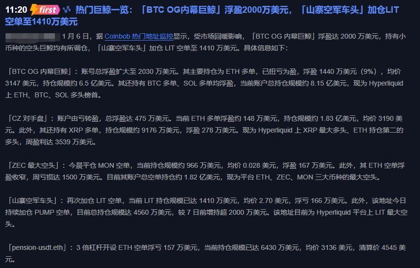 Según las noticias, el mercado en general se está recuperando, y grandes capitales están en movimiento. El OG de BTC, una ballena, ha obtenido una ganancia de 20 millones de dólares, principalmente gracias a posiciones largas en ETH, con un tamaño de posición de 650 millones de dólares, lo que indica que las ballenas son bastante optimistas sobre el futuro. Pero lo más llamativo es 'el cabeza de la fuerza aérea de altcoins', que ha aumentado su posición corta en LIT a 14.10 millones de dólares, con un precio promedio de 2.70 dólares, pero actualmente el precio de LIT es de 3.076 dólares, ¡ya ha perdido 1.66 millones!