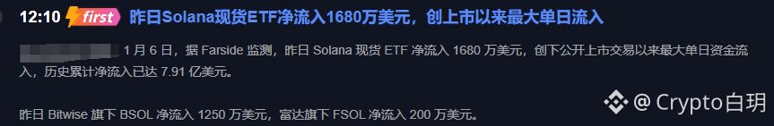 就在昨天,也就是1月6日,根据专业机构Farside的监控数据,Solana的现货ETF产品,单日净流入了足足1680万美元! 这笔钱直接创下了它上市以来的最高单日流入记录。更关键的是,历史累计净流入已经达到了恐怖的7.91亿美元。
