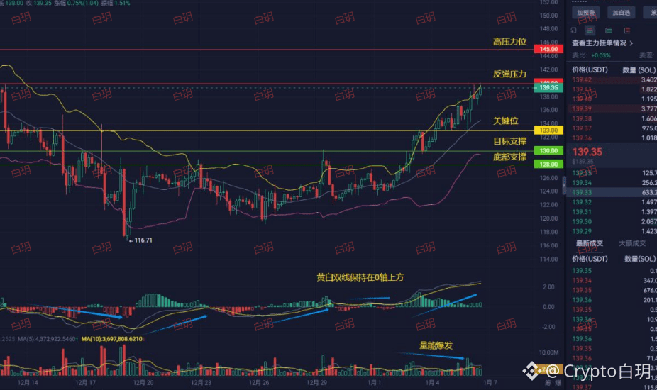 白玥认为,从技术指标看,黄白双线在0轴上方,量能也在配合,说明多头的劲头是足的。现在这个位置,正好卡在关键压力位下面一点,就像一个拳头收回来,正在蓄力。ETF巨额资金流入的利好,很可能就是那个“点火”的催化剂,帮助价格一举冲破139.35甚至145的压力位。