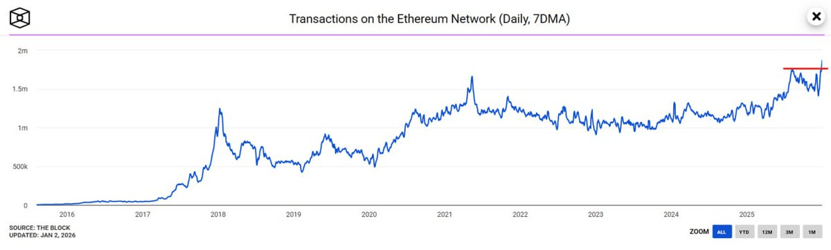 Al mismo tiempo, el uso de la red está cerca de máximos del ciclo. Las transacciones diarias están en tendencia al alza, no a la baja.
