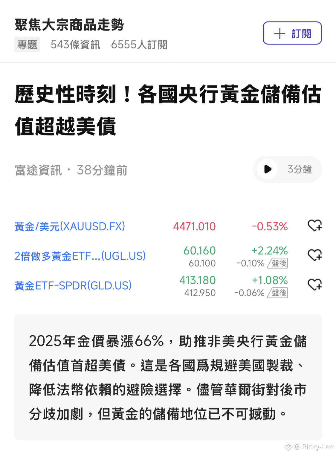 他表示,此類地緣政治事件「是持有黃金的理由,但不一定是今天立刻買入黃金的理由」。 黃金的長期走勢取決於多種因素,包括美國的貨幣和財政政策。通常,減息和高通脹會增加黃金的吸引力。此外,美元的相對強弱以及央行是否持續購金也是值得關注的關鍵變量。