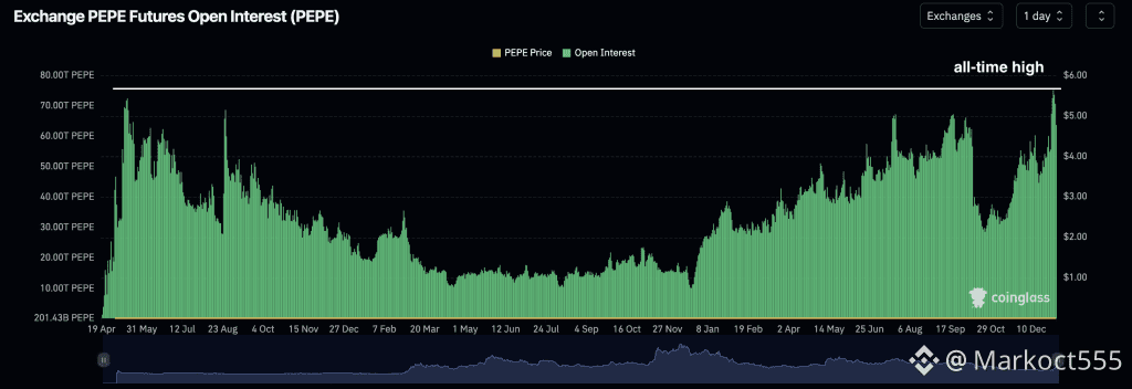 Fresh data from CoinGlass shows PEPE’s open interest (OI) just hit an all-time high on January 3, as futures contracts surged to 75 trillion PEPE.
