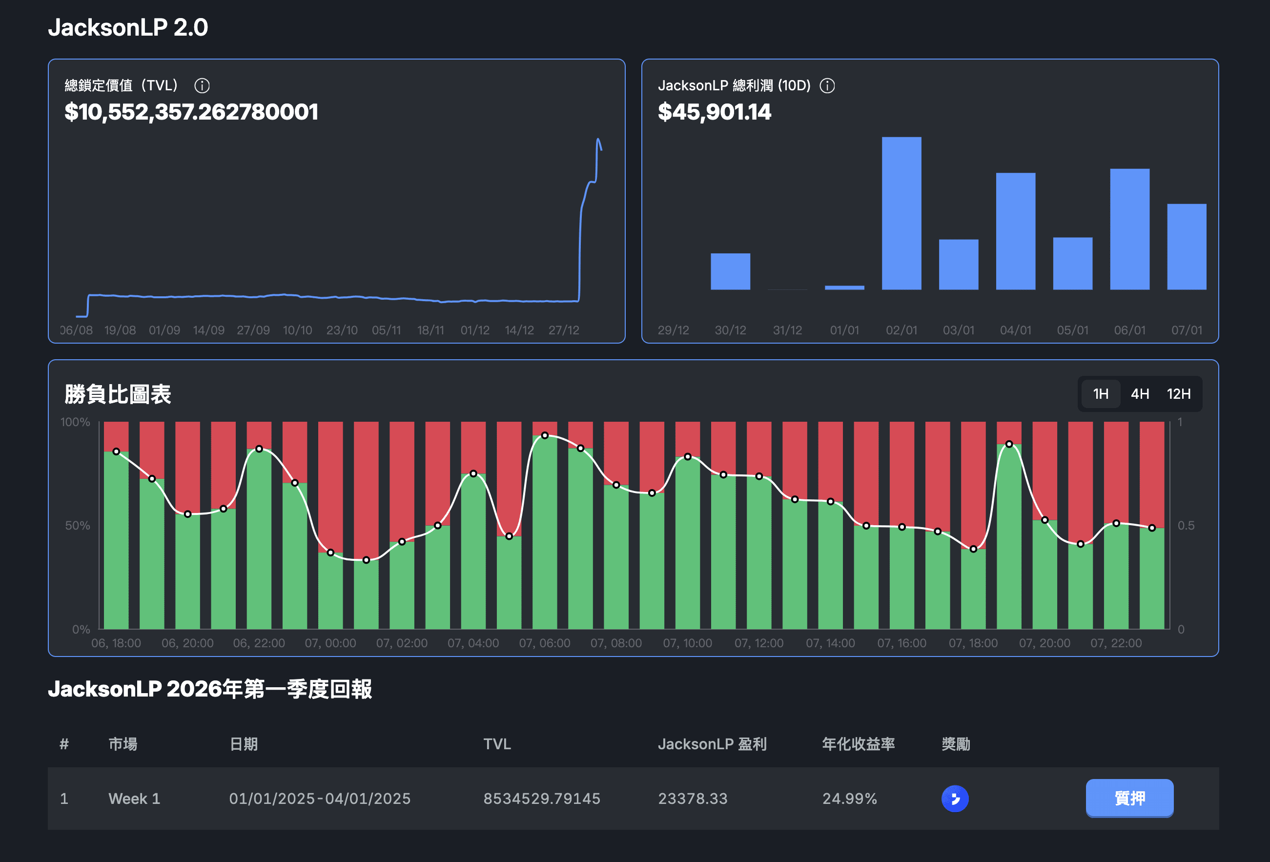 El punto destacado es Jackson LP: apostar $JACKSON para convertirse en 'principal del plataforma', disfrutando de las ganancias y dividendos de la plataforma. Actualmente, el rendimiento anualizado (APY) es del 50%-100%+, y todos los ingresos de la plataforma (operaciones, NFT, etc.) se utilizan para recomprar $JACKSON en el mercado y distribuirlos entre los proveedores de liquidez. En una bull market, el TVL aumentará exponencialmente, creando un ciclo de ganancias sostenible, con mayor valor a largo plazo que las monedas meme que todos suelen copiar. (¡Los rendimientos de la última ronda de LP en 2026 fueron realmente aterradores: ¡45,000 dólares en solo 10 días!)