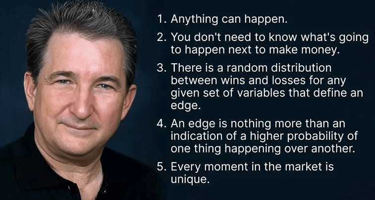 Douglas explica que el mercado es incierto por naturaleza. Incluso la mejor configuración puede fallar. La verdadera ventaja viene al pensar en probabilidades, no en predicciones. Cuando entendí esto, dejé de estar emocionalmente atado a operaciones individuales.