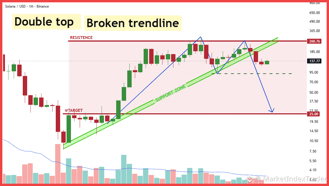 El gráfico mensual $SOL confirma un patrón de doble techo destructivo y una caída decisiva en el apoyo del tendencia alcista principal, con el objetivo de la zona inferior a 20 dólares. Riesgos enormes en el horizonte.