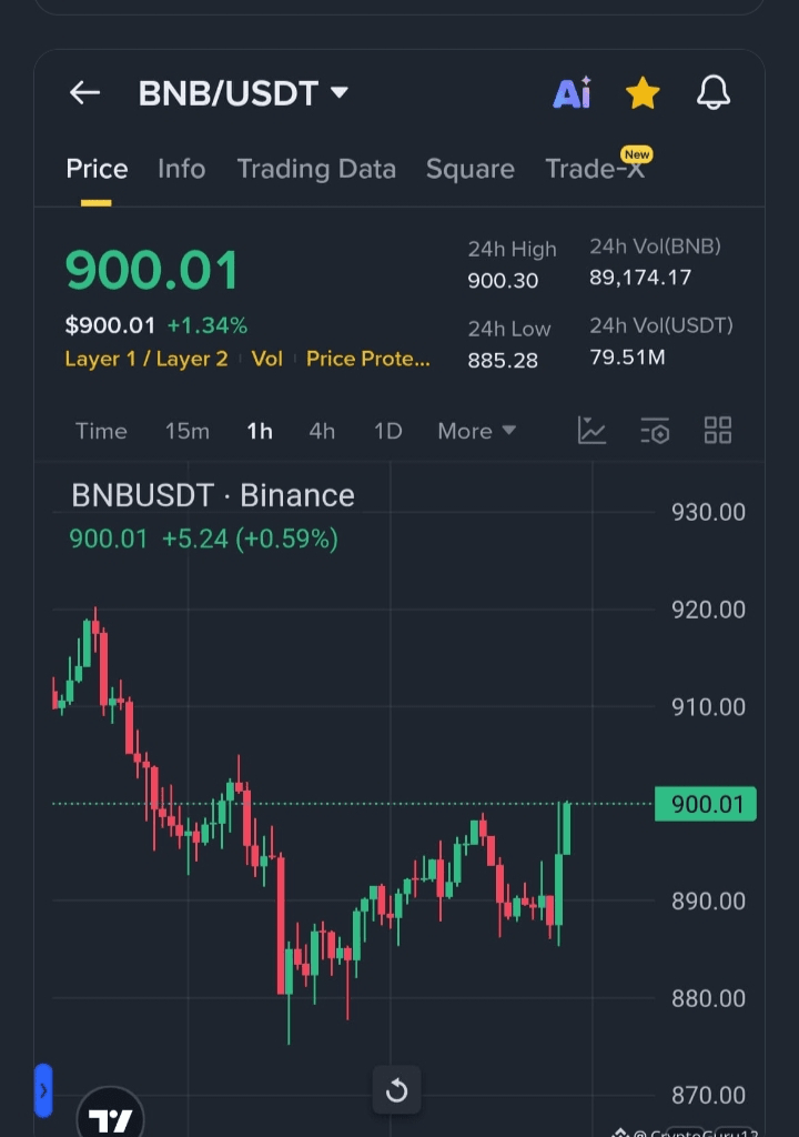 $BNB En el marco de tiempo de 1H se ha mostrado una fuerte recuperación. El precio ha recuperado el nivel psicológico de 900, mientras que se ha mantenido un mínimo más alto cerca de la zona 885–890.