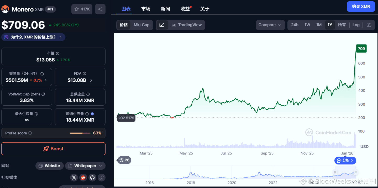 根据 CoinMarketCap (CMC) 2026 年 1 月 14 日的实时监控,XMR 的价格不仅站稳了 $700 大关,甚至在早些时候一度刺穿了 $709.60 的历史天花板(ATH)!