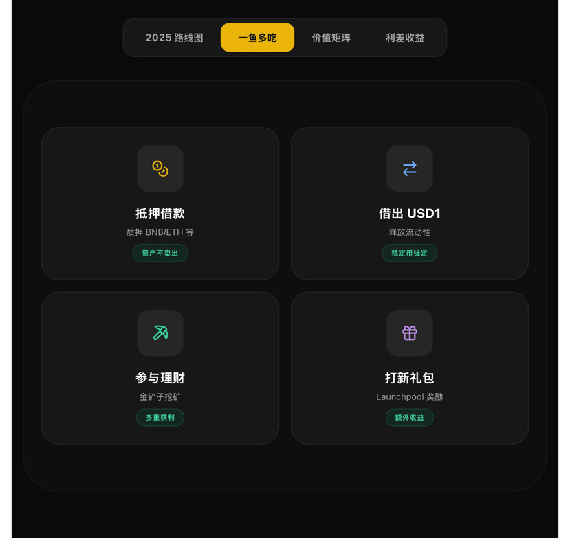 slisBNB (staking de liquidez): al staking BNB, recibirá slisBNB, que acumula automáticamente los rendimientos del staking de BNB. Puede volver a usarlo como colateral para prestar USD1 o proporcionar liquidez en plataformas como PancakeSwap, logrando así "comer un pez y más".