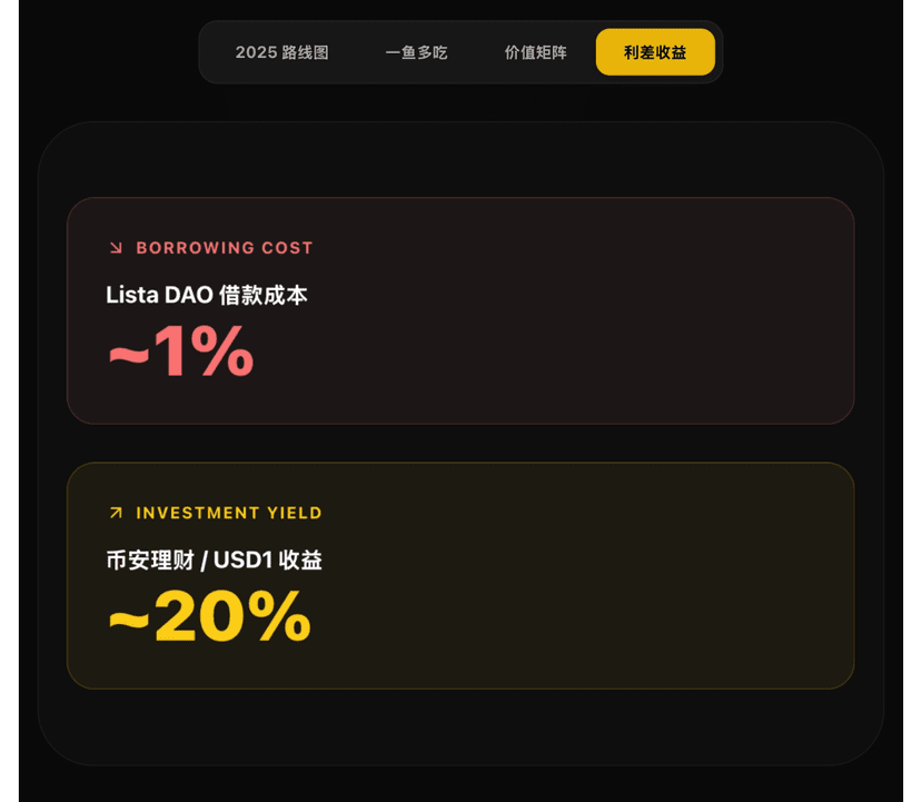Ventaja estratégica: mediante esta diferencia de tasas casi sin riesgo, puede obtener un rendimiento neto de efectivo de aproximadamente el 19% sin vender sus activos subyacentes (como BTCB, ETH, BNB).