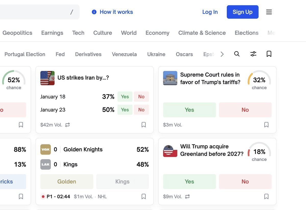 Busca eventos interesantes usando la barra de búsqueda o las categorías (Política, Cripto, Deportes, etc.).