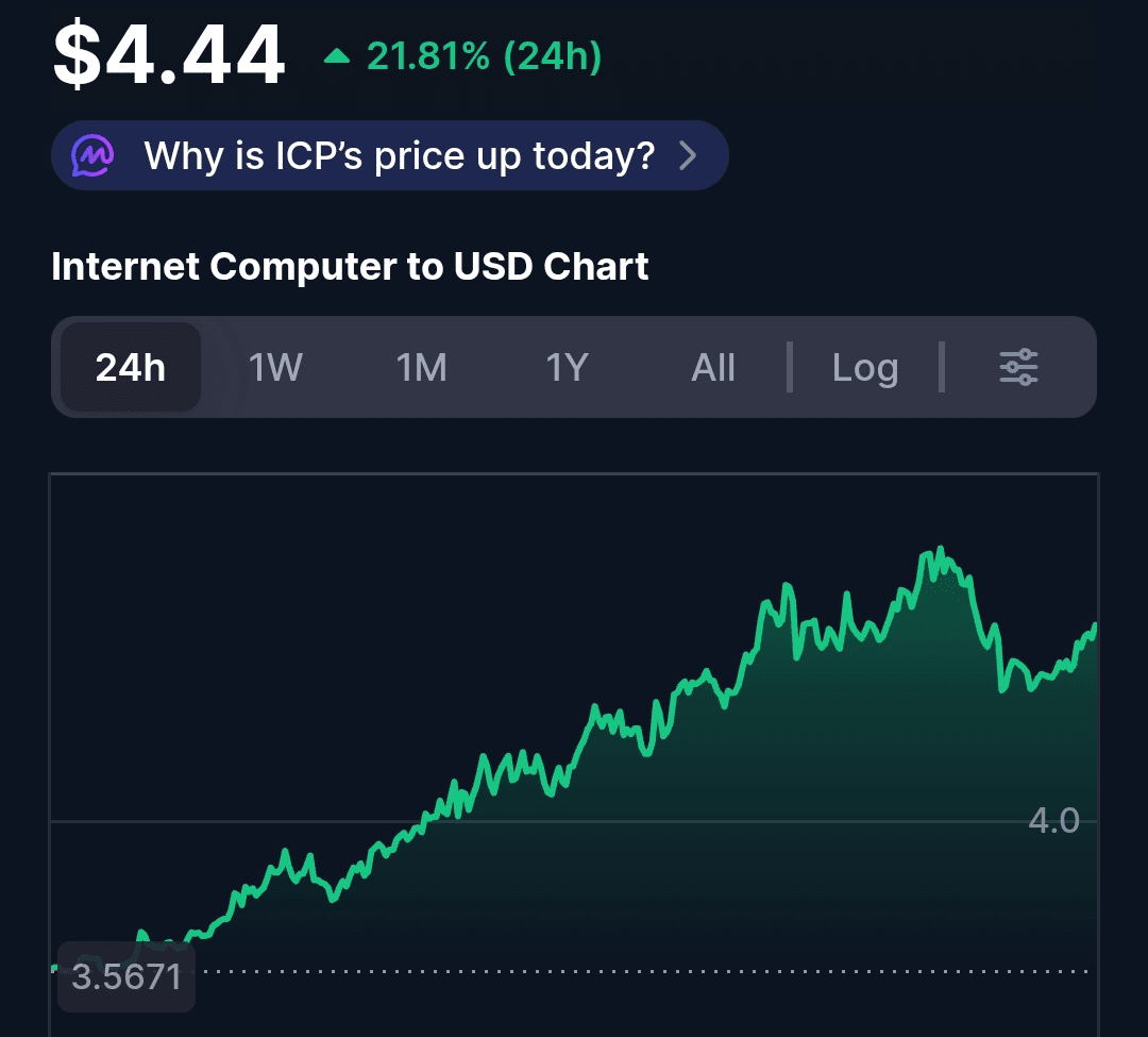 Internet Computer (ICP) subió un 22,51% en las últimas 24 horas, superando la ganancia del mercado cripto generalizada del 0,37%. Esta subida amplía una fuerte racha semanal (+43,03%) y se alinea con el impulso alcista mensual (+50,16%). Estos son los principales factores: