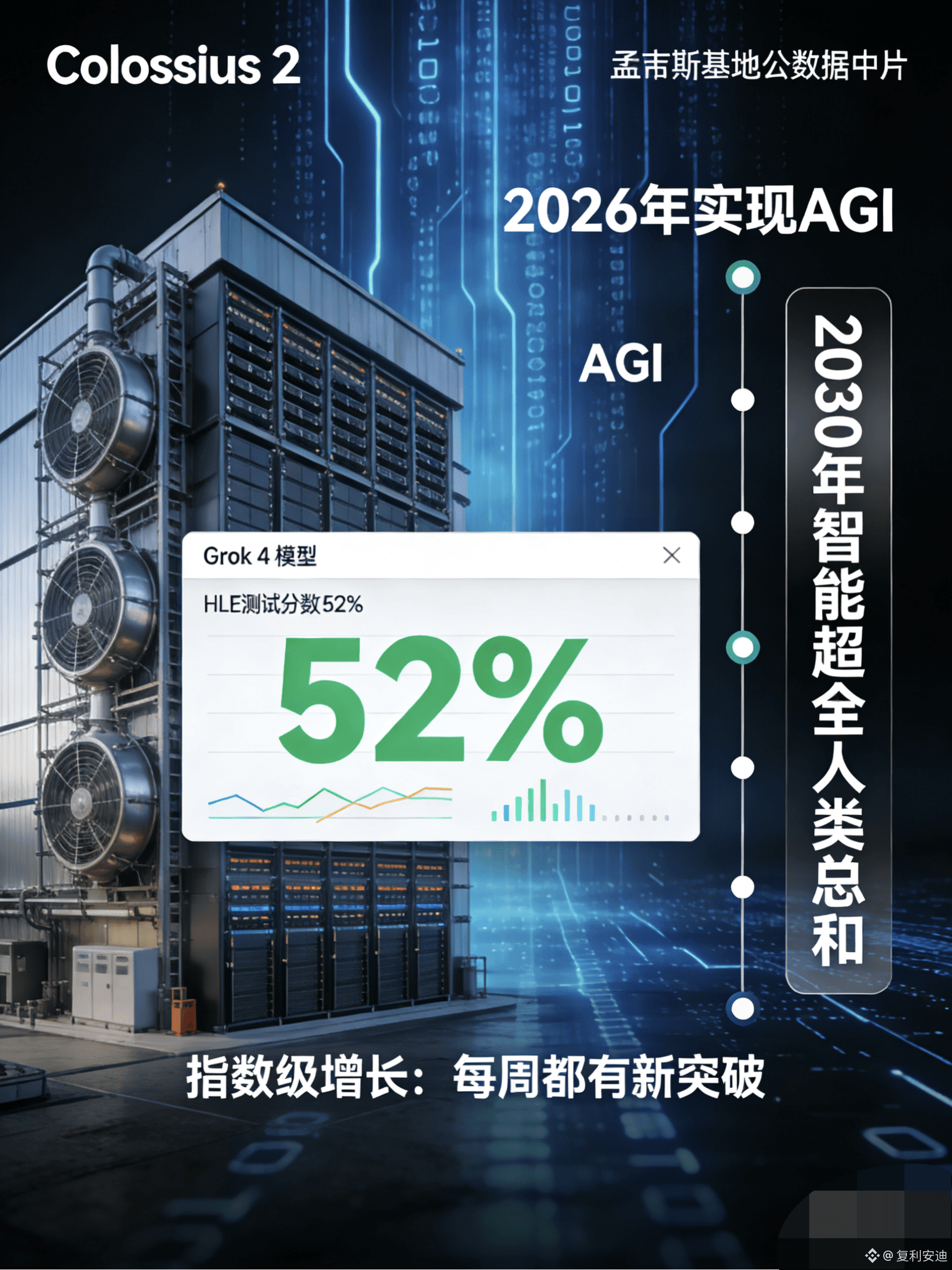 “我们不是在走向起点,我们已经活在起点之中。”访谈开场,马斯克的一句话就让全场安静下来。他手指向身后的Colossus 2数据中心方向,那里正运行着xAI的Grok 4模型——这款模型在“人类最后考试(HLE)”中已拿下52%的分数,而即将推出的Grok 5不仅可能接近满分,还能指出考题本身的逻辑漏洞。“这就是指数级增长的恐怖之处,”马斯克语气平静,“我每周都会被AI的新突破震撼,昨天还觉得不可能的事,今天就成了基础操作。”