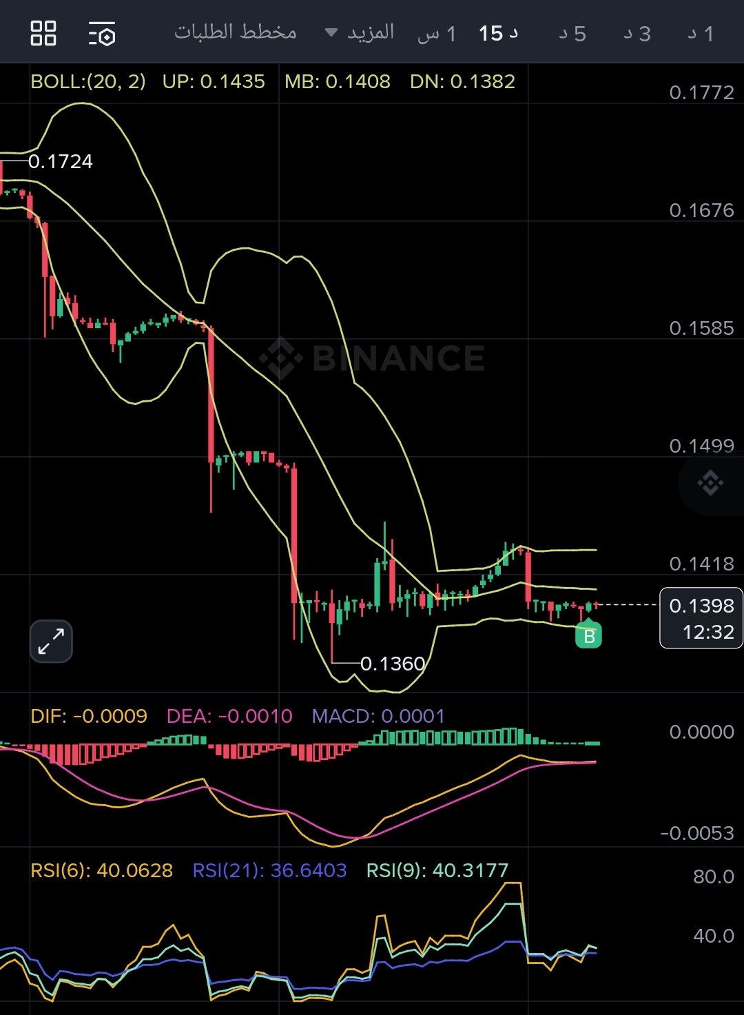 Después de la caída brusca (Dump), el precio se estabiliza actualmente por encima de las medias móviles cortas, hay un intento de rebote (Bounce) pero el precio aún está por debajo de la media móvil MA(99).