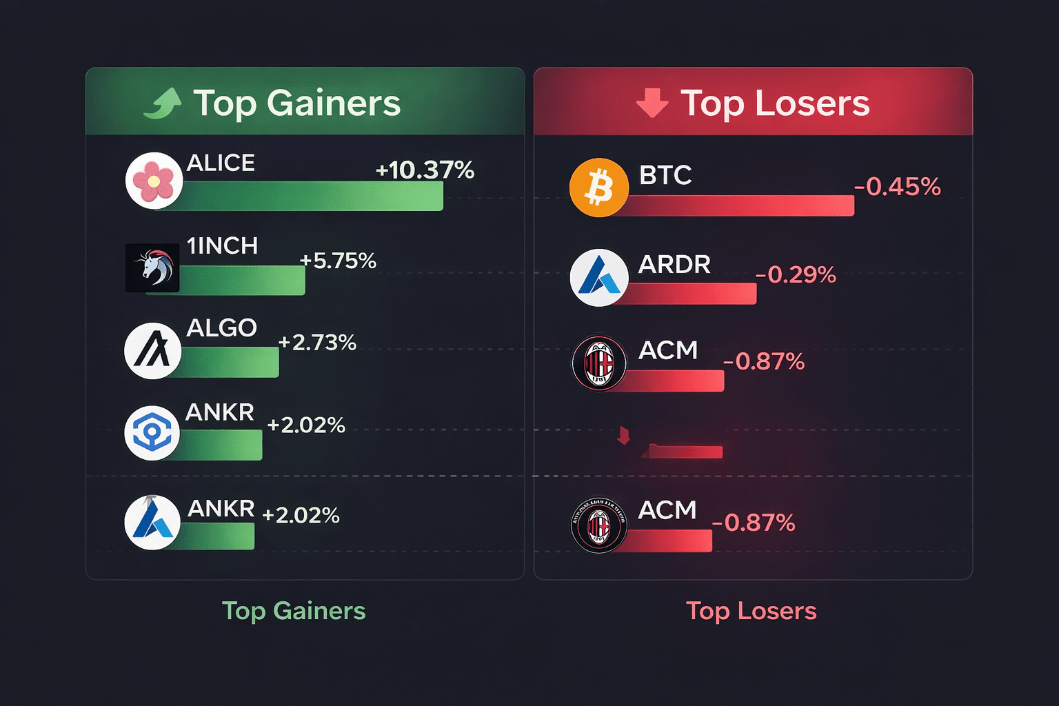 • Este gráfico del mercado de Binance muestra un desempeño mixto$XRP entre las principales criptomonedas. ALICE es el mayor ganador con un fuerte aumento de +10.37%, lo que indica un alto interés de compra y un impulso a corto plazo. 1INCH, ALGO, ANKR y AAVE también muestran ganancias positivas, sugiriendo fortaleza entre las altcoins seleccionadas. Por el lado negativo, Bitcoin (BTC) registra una ligera pérdida de −0.45%, reflejando una corrección menor del mercado. ACM y ARDR# también están en rojo, mostrando una débil demanda en comparación con los ganadores. En general, el gráfico resalta un movimiento más fuerte en las altcoins mientras que las monedas de gran capitalización permanecen relativamente estables. #ACM #MarketRebound #BTC100kNext?