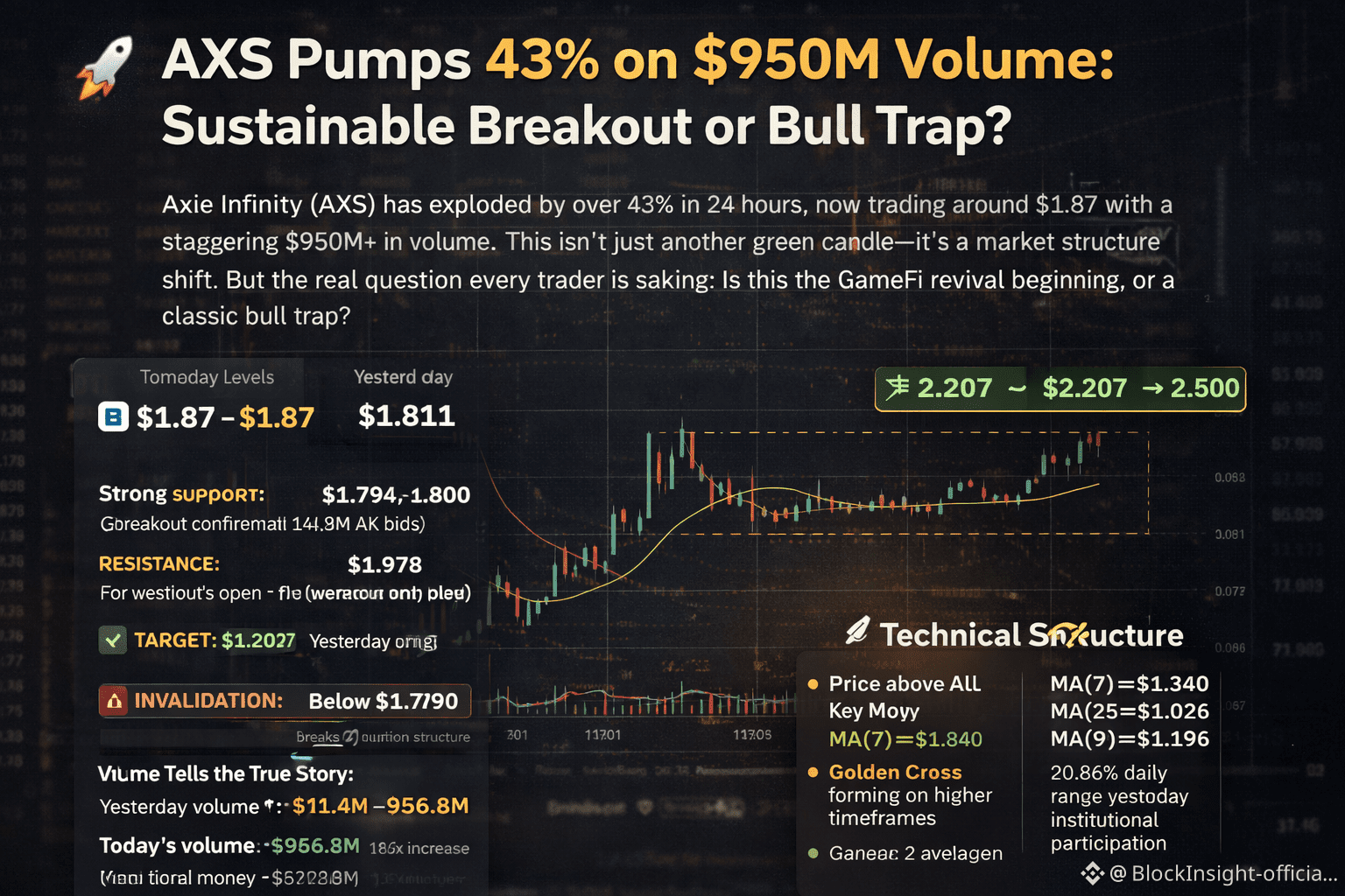 Axie Infinity ($AXS ) has exploded by over 43% in 24 hours, now trading around $1.87 with a staggering $950M+ in volume. This isn't just another green candle—it's a market structure shift. But the real question every trader is asking: Is this the GameFi revival beginning, or a classic bull trap?