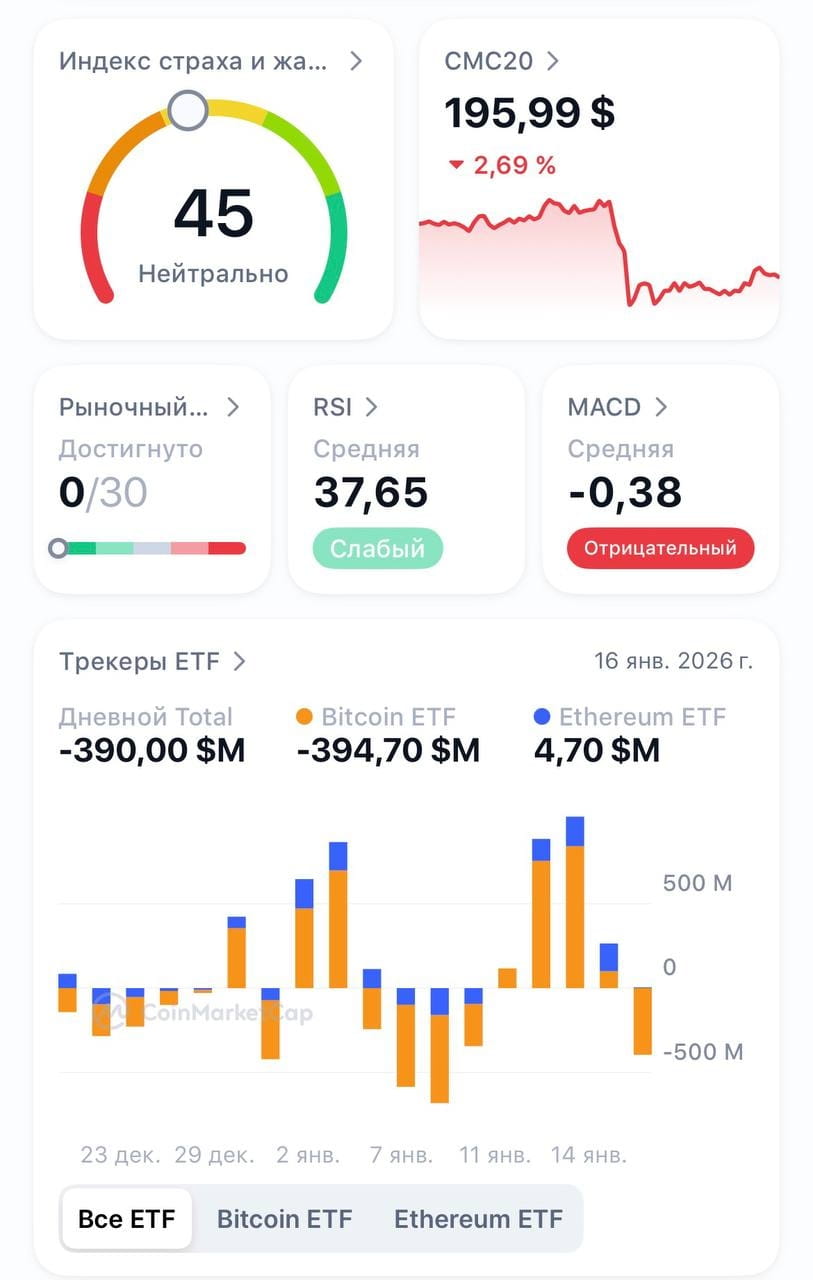 Bitcoin: Cayó desde un nivel de alrededor de $95,5 mil hasta mínimos por debajo de $92,5 mil, perdiendo más del 2.6% en unas pocas horas la mañana del 19 de enero. A media jornada, el precio se estabilizó alrededor de $92,9 mil.