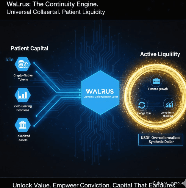 Rather than treating liquidity as an emergency tool, Walrus treats it as an ongoing condition of capital. The protocol is built around a simple but powerful observation. Most holders do not want to abandon their assets. They believe in them. They want exposure, not liquidation. Yet markets move, opportunities arise, and capital must remain usable. Walrus steps into this tension and resolves it not with leverage or complexity, but with structure.