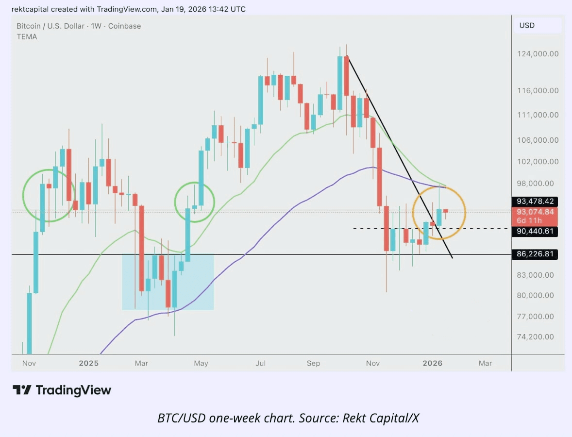 El analista Rekt Capital advirtió que Bitcoin debe recuperar $93,500 para mantener intacta la ruptura semanal. El fracaso podría exponer la apertura anual 2026, un nivel que los traders creen que probablemente será puesto a prueba.