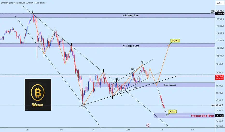 Mientras se mantenga el soporte base, una continuación hacia la débil zona de suministro alrededor de la región de 108K sigue siendo viable. Sin embargo, el fallo en mantener esta estructura abre la puerta a una extensión bajista más profunda hacia el área de demanda proyectada cerca de 76.5K.