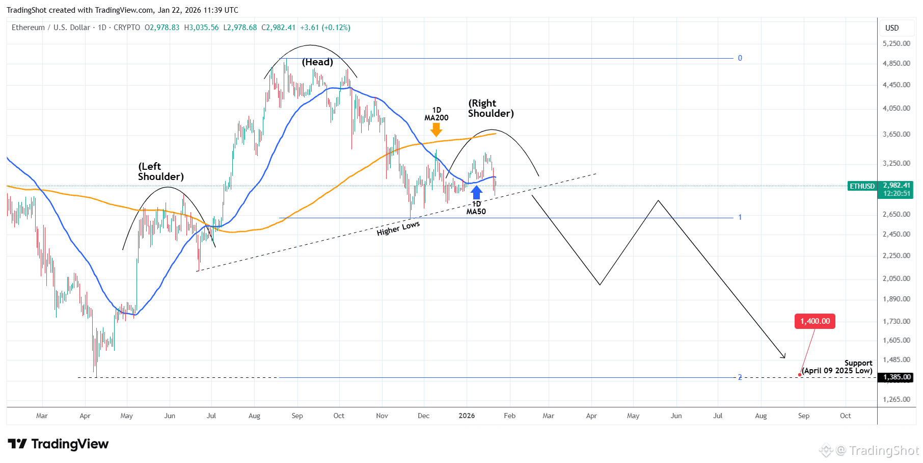 En el gráfico diario de ETHUSD, la acción del precio ha estado esculpiendo metódicamente una clásica formación de Cabeza & Hombros (H&S), una de las estructuras de reversión bajista macro más confiables históricamente en el análisis técnico.