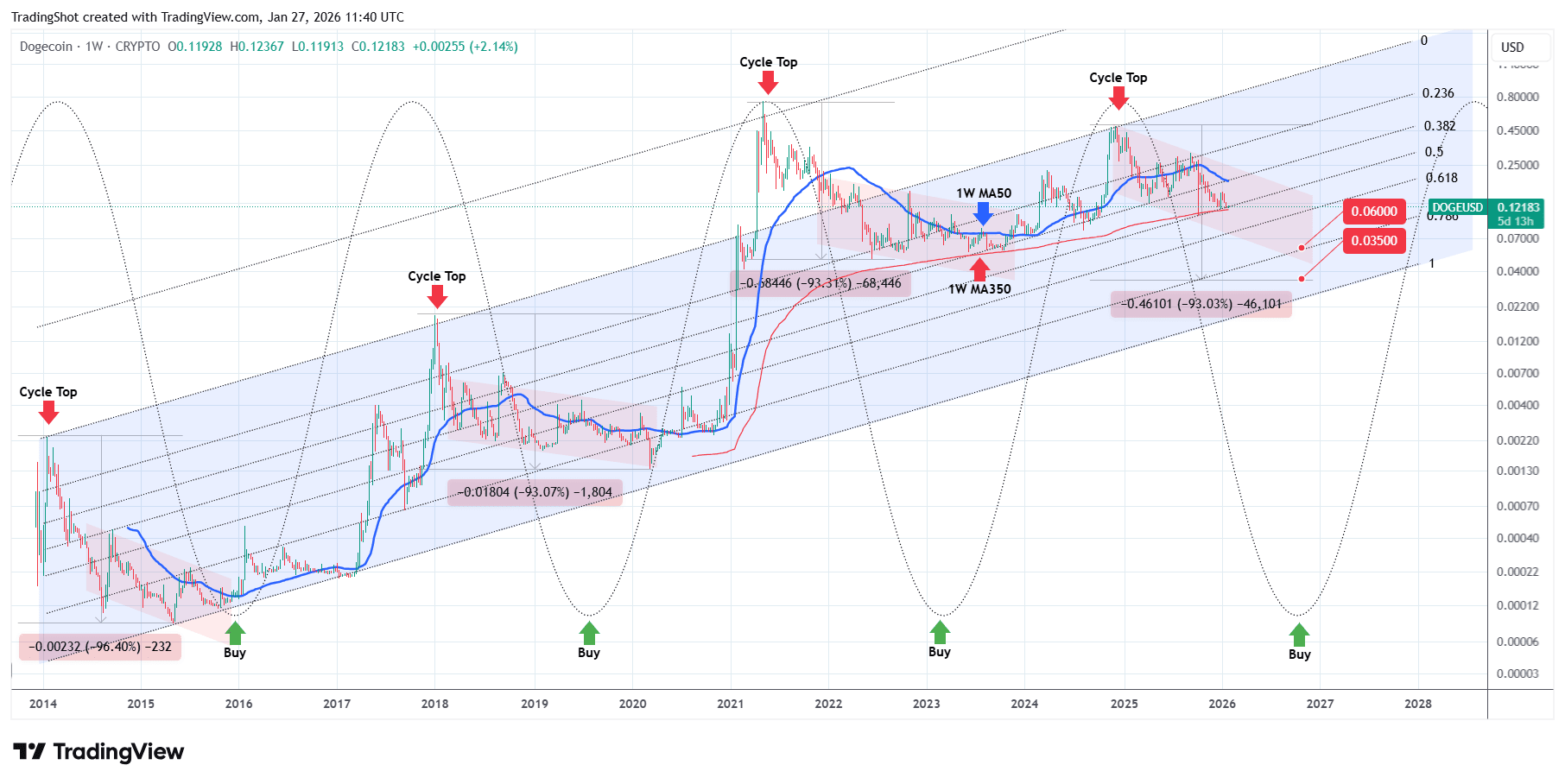 El MA350 de 1 semana en particular es de la máxima importancia ya que mantuvo su posición como Soporte durante ambos Ciclos Bajistas anteriores. Como resultado, si se rompe ahora, hay altas probabilidades de iniciar la Fase 2 del Ciclo Bajista. Esto puede tocar el nivel de retroceso de Fibonacci 0.786 del histórico Canal de Fib de Doge en alrededor de $0.0600 o extenderse a un declive completo del -93.00% (tanto como los anteriores dos corrigieron) alrededor de $0.03500.