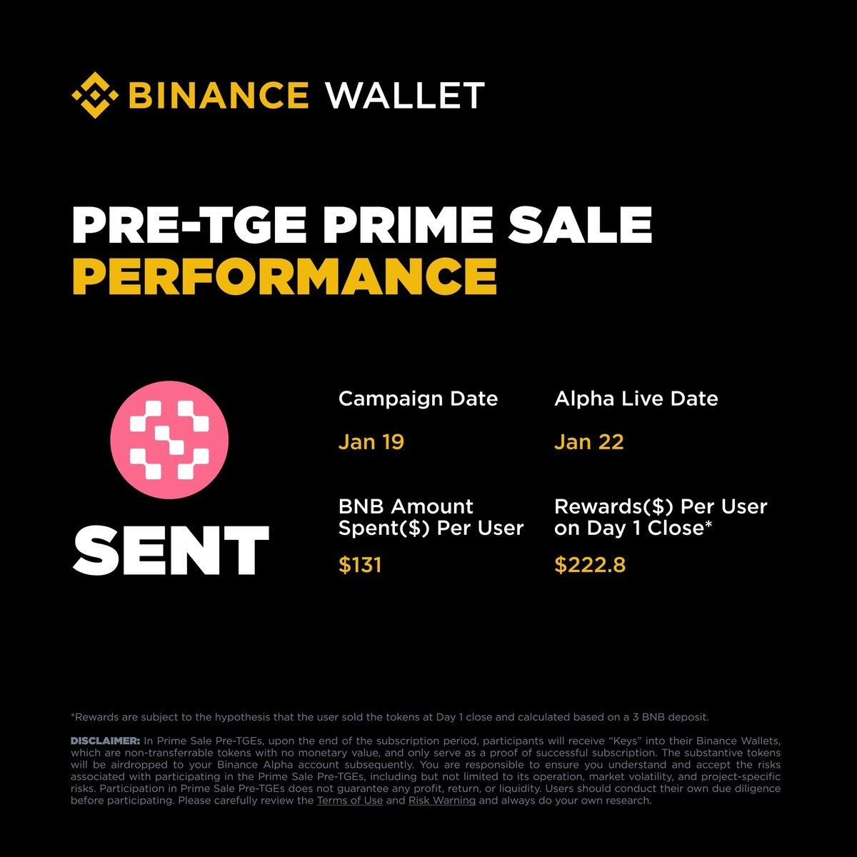 El reciente $SENT Pre-TGE en Binance Wallet Prime Sale entregó señales tempranas fuertes, con usuarios gastando alrededor de $131 en promedio y ganando aproximadamente $222.8 en recompensas al cierre del Día 1. Este rendimiento destacó una fuerte demanda temprana y estableció un sólido punto de referencia para los próximos eventos de Prime Sale.
