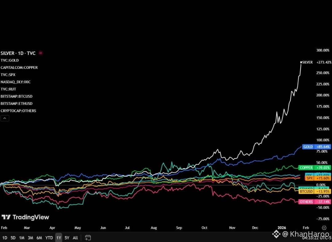 Over the past year, traditional and digital assets have shown a stark divergence in performance. Gold, long considered a safe haven, surged +84%, while silver skyrocketed +267%, highlighting investor rotation into tangible assets amid macroeconomic uncertainty.