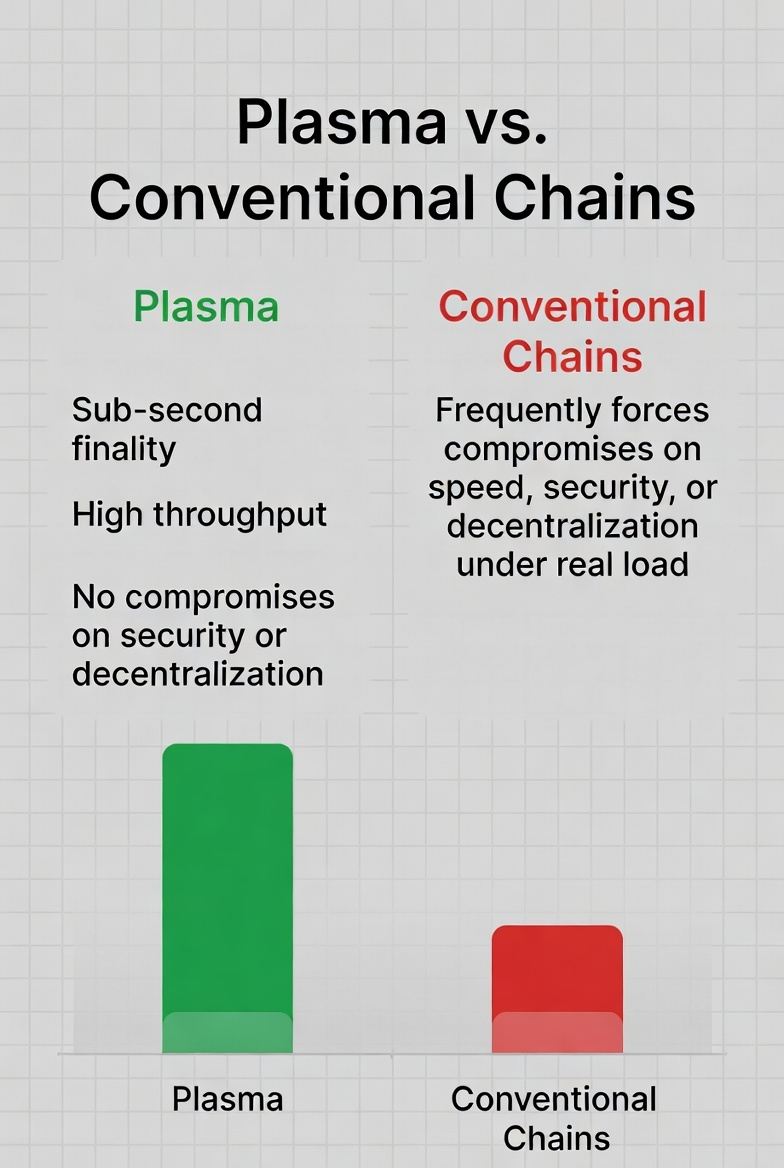 El segundo pone números a la ventaja, comparando la finalización en subsegundos de Plasma y su alta capacidad frente a cadenas convencionales que frecuentemente obligan a compromisos en velocidad, seguridad o descentralización bajo carga real.