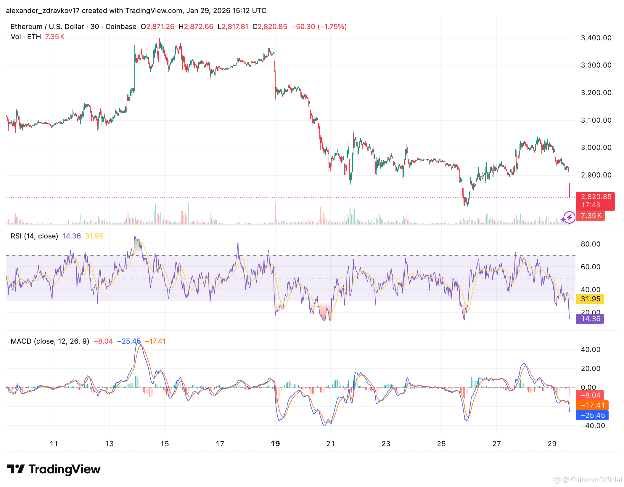 Ethereum has lost the $2,900 support, shifting short-term momentum bearish
