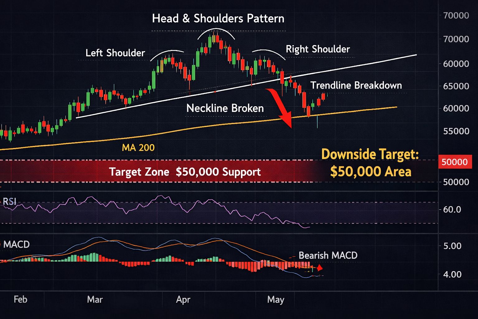 El comportamiento reciente del precio de Bitcoin ha completado un patrón de Cabeza & Hombros de libro de texto—frecuentemente una señal fuerte de que el impulso alcista se ha agotado y los vendedores están tomando el control.