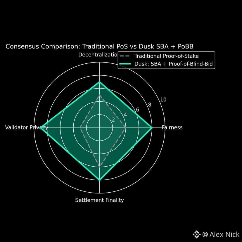 Dusk uses a privacy aware proof of stake model combined with blind bidding mechanisms that reduce concentration of power. Validator identities and bidding behavior remain concealed while still maintaining fairness and security. This reduces the risk of dominant actors exerting control and it aligns with regulatory expectations around decentralization and resilience.