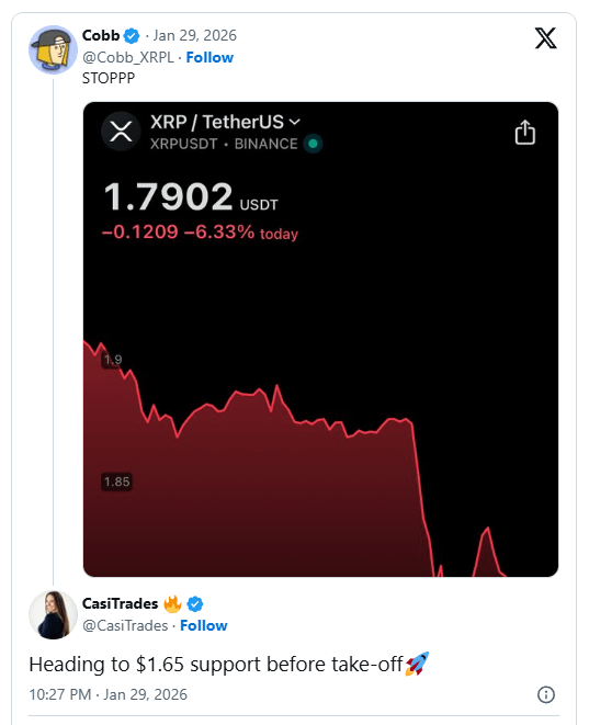 El 29 de enero de 2026, XRP cayó aproximadamente un 6.3%, deslizándose a $1.79 USDT antes de extenderse a la baja. El gráfico de Binance compartido por Cobb mostró un claro fracaso en mantener el nivel de soporte de $1.79, acompañado de un notable aumento en el volumen de comercio. Esta combinación señaló una fuerte presión de venta en lugar de un barrido breve de liquidez.