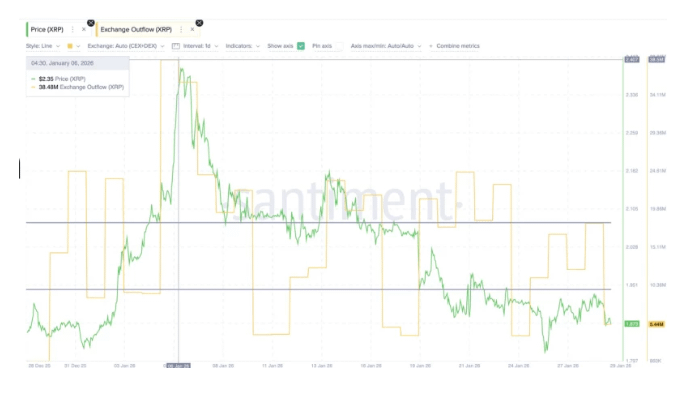 👉 XRP vio un aumento masivo en los flujos de salida de intercambio durante la primera semana de enero mientras la acción del precio se mantenía fuerte. Los flujos de salida de intercambio aumentaron de aproximadamente 8.9 millones de XRP el 1 de enero a alrededor de 38.5 millones de XRP para el 6 de enero—un aumento del 330%. El aumento ocurrió justo cuando el precio de XRP estaba subiendo, mostrando que los tenedores estaban sacando sus monedas de los intercambios en lugar de volcarlas en el mercado.