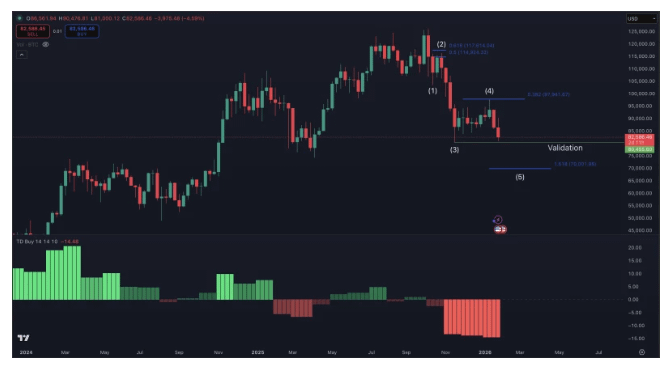 👉 El gráfico muestra lo que parece ser un patrón correctivo de cinco ondas, con Bitcoin posiblemente moviéndose hacia la última onda a la baja. El objetivo medido para la onda cinco se sitúa cerca de $70,000—justo en línea con la extensión de Fibonacci 1.618 en $70,002. Las zonas de retroceso anteriores, como el nivel de 0.382 de Fib alrededor de $97,900, no pudieron mantenerse, respaldando la lectura bajista sobre la estructura.