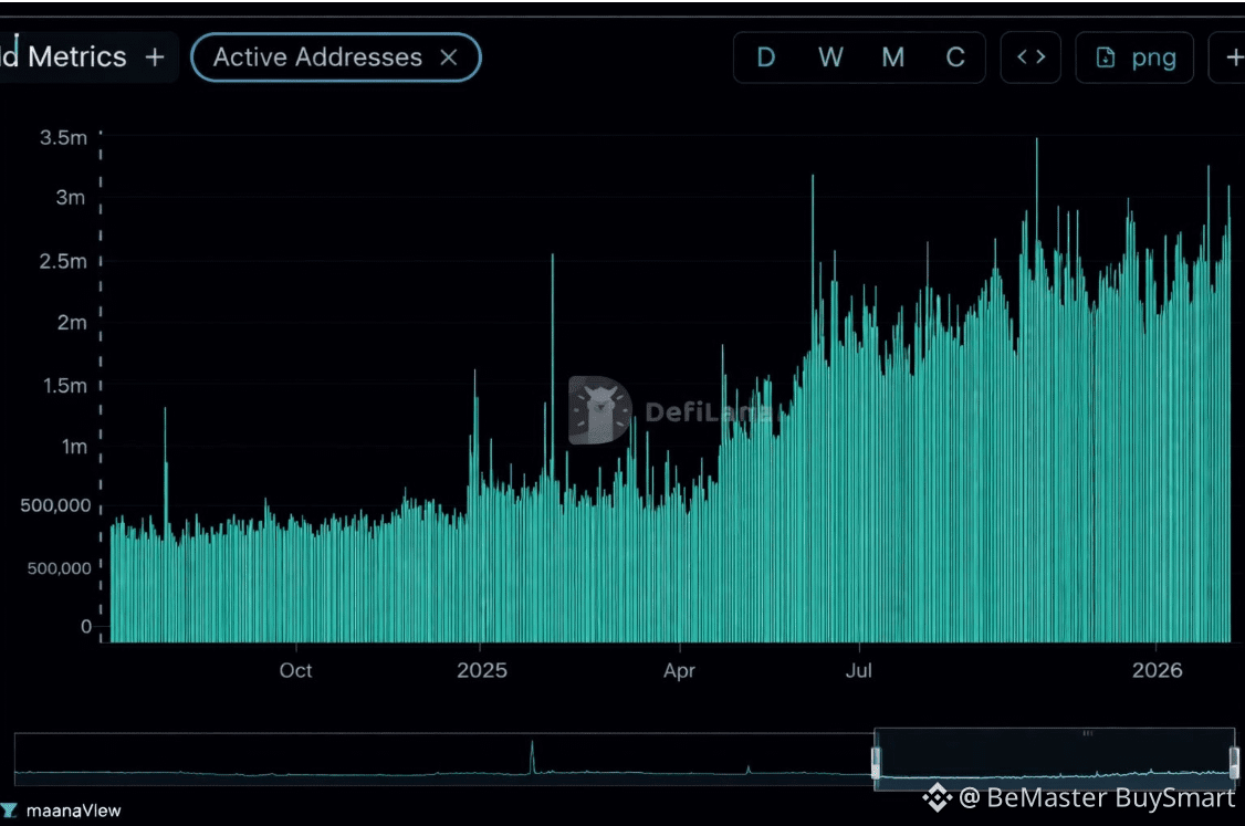 $BNB Chain's daily active addresses jumped from 1 million to over 3 million between mid-2025 and early 2026, showing genuine sustained growth instead of temporary hype.