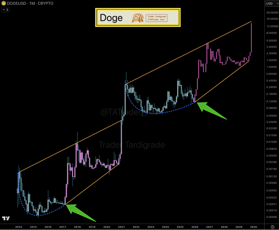 👉 El gráfico revela un canal ascendente a largo plazo que ha estado dirigiendo el movimiento de DOGE durante años. En el último ciclo, la moneda formó un fondo redondeado antes de subir a lo largo del canal. Ahora estamos viendo la misma configuración redondeada seguida de un nuevo impulso ascendente—signos claros de que este patrón se mantiene a lo largo del tiempo.