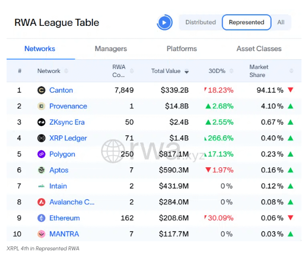 Con un aumento moderado en otros RWA representados existentes, los activos tokenizados representados del XRPL han crecido ahora a $1.44 mil millones, un aumento del 266% en los últimos 30 días. Esta cifra coloca al libro mayor en cuarto lugar entre las blockchains con los mayores RWA representados.