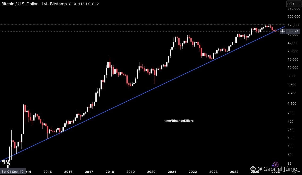 O preço está pressionando a linha de suporte ascendente de longo prazo — um nível que tem definido a tendência macro por 12 anos.